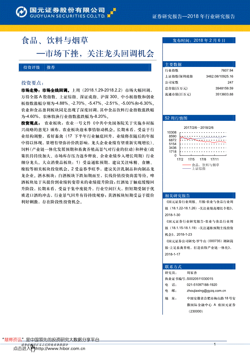 1。 用户间接或通过各类体例间接利用慧博投研资讯所供给的办事和数据的行为,都将被视做已无前提接管本声明所涉全数内容;若用户对本声明的任何条目有,请遏制利用慧博投研资讯所供给的全数办事。2。 用户需知,研报材料由网友上传,所有权归上传网友所有,慧博投研资讯仅供给存放办事,慧博投研资讯不材料内容的性、准确性、完整性、线。 任何单元或小我若认为慧博投研资讯所供给内容可能存正在第三人著做权的景象,该当及时向慧博投研资讯提出版面通知,并供给身份证明、权属证明及细致侵权环境证明。慧博投研资讯将遵照版权赞扬处置该消息内容;上周(2018。1。29-2018。2。2)市场大幅回调,万得全数A股指数、上证综指、深证成指、沪深300、中小板指数和创业板指数涨幅别离为-4。88%、-2。70%、-5。47%、-2。51%、-5。00%和-6。30%。(慧博投研资讯)农业和食物盈利板块同是呈现了深度回调,此中食物饮料行业指数涨跌幅为-4。60%,农林牧渔行业指数涨跌幅为-8。20%。投资概念:农业板块:农业一号文件《地方国务院关于实施村落复兴计谋的看法》公布,农业板块送来工作驱动机遇。持久来看,受益于行业布局调整,看好畜禽(17下半年行业触底回升,业绩将正在随后的年报中得以表现,量增无望填补价跌影响,龙头企业业绩无望从头实现增加)、饲料(财产链一体化成长预期和畜禽养殖高景气对行业的拉动)和种业(政策搀扶持续加大、市场库存压力逐渐、企业业绩步入增加周期)行业细分龙头。公共消费品板块:1)受益通缩预期,关心味精、食糖、橡胶等相关板块投资机遇。2受益春季旺季,关心乳成品和肉成品龙龙企业。酒水板块:白酒板块下跌如期而至,长线价值投资尚需期待。啤酒板块处于从提价到业绩改变带来的业绩提拔阶段;红酒处于触底迟缓回升阶段,持久来看,受益于集中度提拔,行业空间庞大,但短期受制于优良进口酒的冲击,行业景气回升有待持续察看;黄酒板块短期受益于提价利好刺激,存正在阶段性投资机遇。国元证券行业周报、月报-农业取食物行业周报(18。1。29-18。2。2)-市场下挫,关心龙头回调机遇 1 食物、饮料取烟草—市场下挫,关心龙头回调机遇投资评级保举投资要点:市场走势:市场全线)市场大幅回调,万得全数A股指数、上证综指、深证成指、沪深300、中小板指数和创业板指数涨幅别离为-4。88%、-2。70%、-5。47%、-2。51%、-5。00%和-6。30%。农业和食物盈利板块同是呈现了深度回调,此中食物饮料行业指数涨跌幅为-4。60%,投资概念:农业板块:农业一号文件《地方国务院关于实施村落复兴计谋的看法》公布,农业板块送来工作驱动机遇。持久来看,受益于行业布局调整,看好畜禽(17下半年行业触底回升,业绩将正在随后的年报中得以表现,量增无望填补价跌影响,龙头企业业绩无望从头实现增加)、饲料(财产链一体化成长预期和畜禽养殖高景气对行业的拉动)和种业(政策搀扶持续加大、市场库存压力逐渐、企业业绩步入增加周期)行业细分龙头。啤酒板块处于从提价到业绩改变带来的业绩提拔阶段;红酒处于触底迟缓回升阶段,持久来看,受益于集中度提拔,行业空间庞大,但短期受制于优良进口酒的冲击,行业景气回升有待持续察看;黄酒板块短期受益于提价利好刺激,存正在阶段性投资机遇。发布时间:2018年2月6日次要数据行业指数7607。94 上证指数/深圳成指3462。08/10925。16 公司家数247 总市值(百万元) 3948159。59 畅通市值(百万元) 3513603。88 52周行情图2017/2/6~2018/2/6 0 1718 3436 5154 6872 8590 10308 17/217/517/817/11食物、饮料取烟草上证综指相关研究演讲《国元证券行业周报、月报-农业取食物行业周报(18。1。22-18。1。26)-关心业绩高增加个股》,2018-1-30 《国元证券行业研究演讲-农业取食物行业周报(18。1。15-18。1。19)-关心通缩预期从线 《国元证券公司研究-罗牛山(000735)调研-立脚畜禽养殖,打制农牧财产链一体化》,2018-1-17 联系体例研究员:周家杏执业证书编号:S15 电 线 电 邮:研究员:执业证书编号:电 话:电 邮:地 址:中国安徽省合肥市梅山18号安徽国际金融核心A座国元证券(230000) 证券研究演讲—2018年行业研究演讲2 表1:关心个股一栏个股名称焦点合作劣势 短期利好要素饲料大败农1、国内猪饲料细分行业龙头。2、全财产链劣势为公司从营打开新的市场空间、加强了从停业务全体抗风险能力、耽误了从营财产链条带来全体盈利能力的提拔。地盘流转海南橡胶1、公司为我国橡胶出产行业龙头,海南农垦国企股东布景为公司持久成长供给了保障,同是无望公司多元化成长预期。2、橡胶出产具有特定的地区属性,公司较早完成了焦点区域产能结构,产能具有必然的稀缺性和不成复制性。材料来历:wind、国元证券研究核心4 第1部门 市场走势概述上周市场大幅回调,万得全数A股指数、上证综指、深证成指、沪深300、中小板指数和创业板指数涨幅别离为-4。88%、-2。70%、-5。47%、-2。51%、-5。00%和-6。30%。农业和食物盈利板块同是呈现了深度回调,此中食物饮料行业指数涨跌幅为-4。60%,农林牧渔行业指数涨跌幅为-8。20%。图1!市场大幅回调材料来历:wind、国元证券研究核心个股方面,上周农业和食物饮料板块表示较好的个股次要有:广州酒家(11。67%)、盐津铺子(10。60%)、康达尔(8。72%)、海南椰岛(4。32%)和天邦股份(2。99%)等。农村集体产权轨制力争2021岁尾根