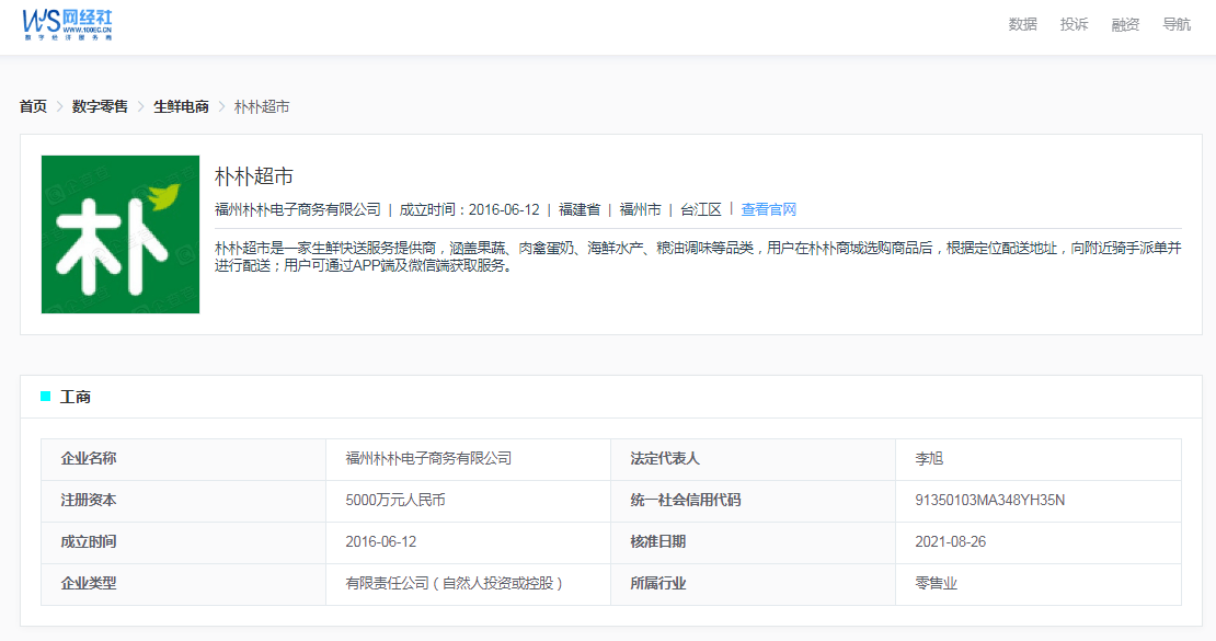 据网经社企业库显示,“朴朴超市”附属于福州朴朴电子商务无限公司,该公司成立于2016年6月12日,代表报酬李旭。