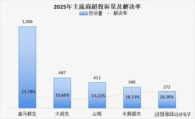 盒马鲜生、大润发、山姆的赞扬量位列前三。此中盒马鲜生赞扬量达1306件,占比为19。06%,是当前赞扬量最高的线下商超。正在赞扬处理率方面,各大商超的处置效率全体偏低,处理率最高的永辉超市仅为18。53%。