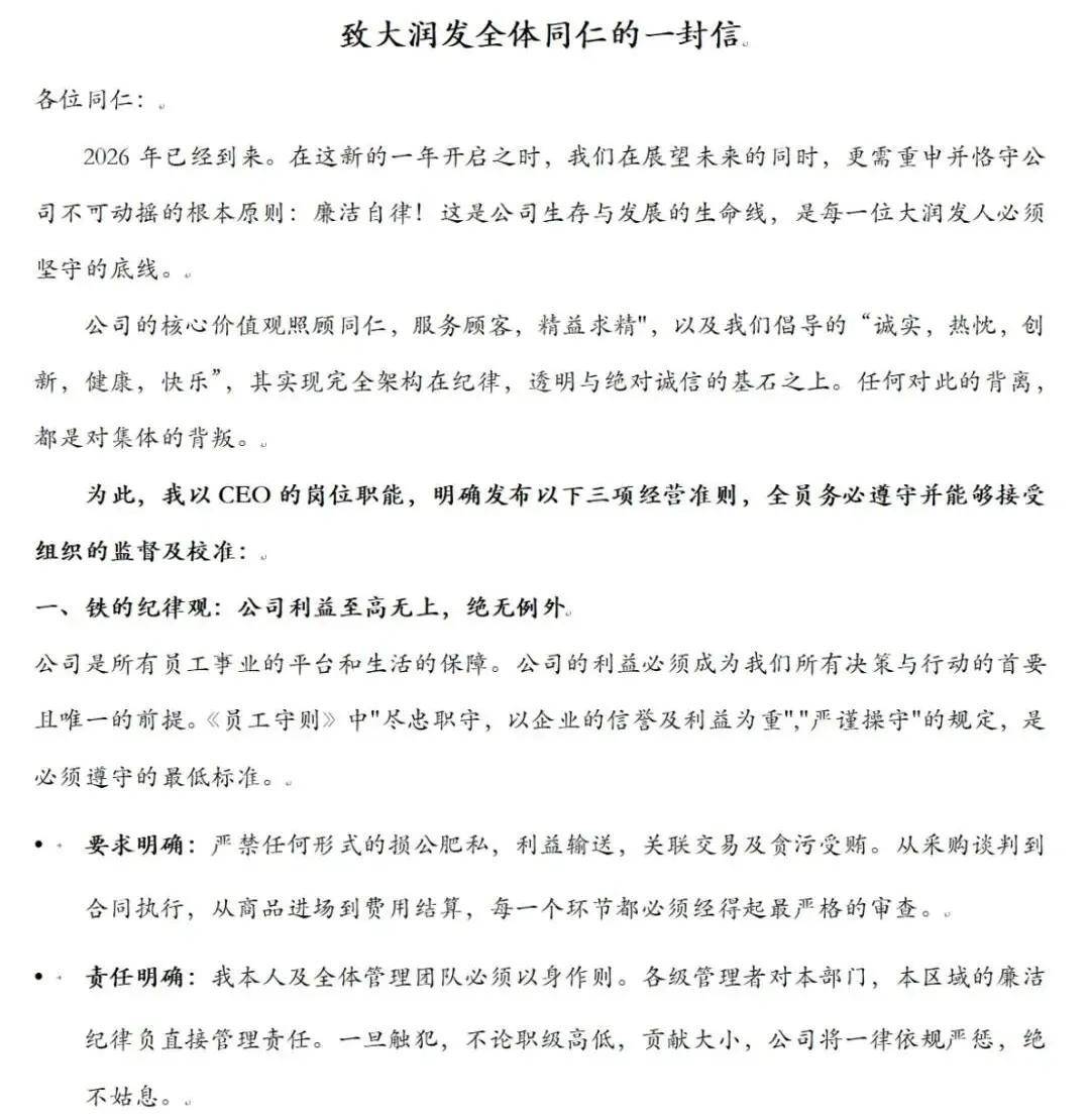 正在此布景下,2026岁首年月,李卫平还签发了《致大润发全体同仁的一封信》,沉申了大润发不成的底子准绳:清廉自律,是所有大润发人必需苦守的底线。